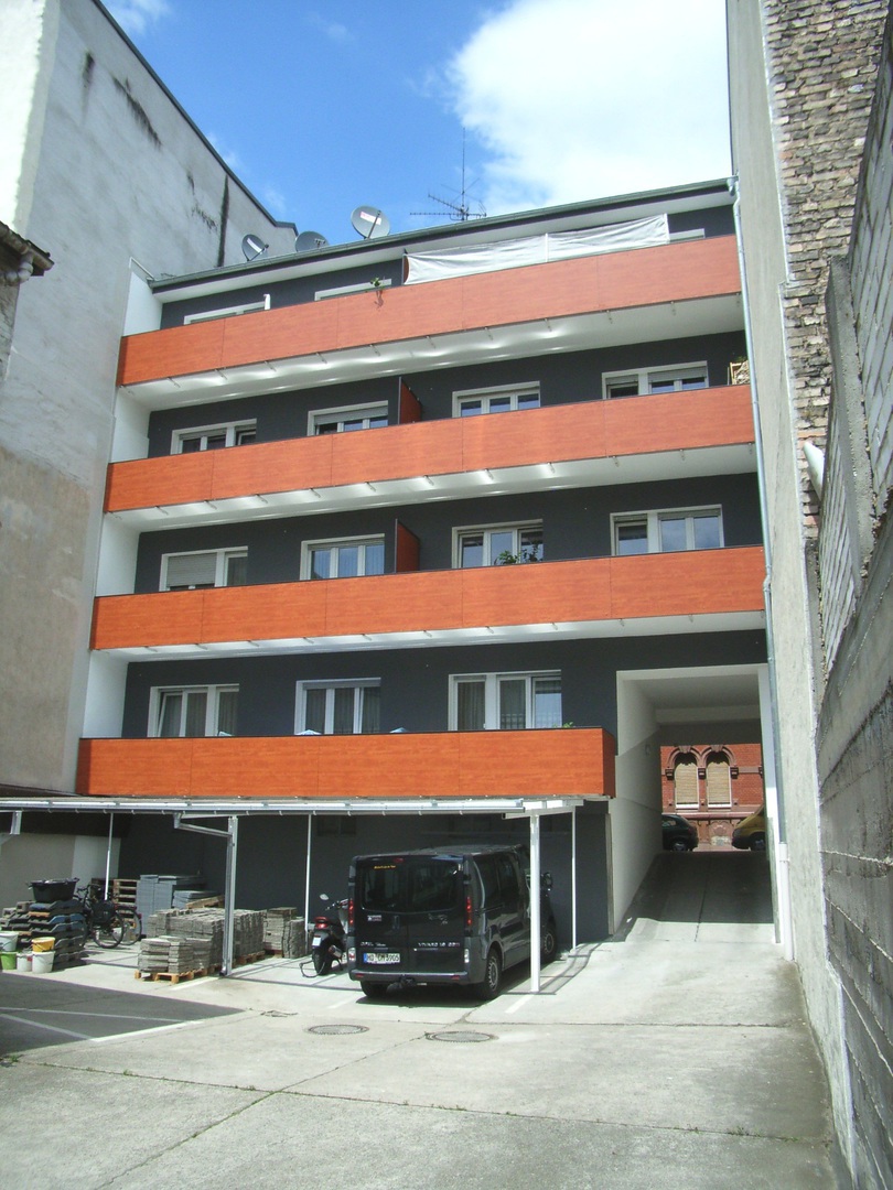 Der Baukörper ist mit einem zurückhaltenden Grauton gefasst. Die Fensterleibungen, auskragende Elemente und Durchfahrt sind weiß beschichtet. Die Balkonbrüstungen der Hofseite und das Treppenhaus Straßenseite wurden in einem freundlichen Holzfarbton abgesetzt. Die Mieter sollten während der Arbeiten möglichst wenig beeinträchtigt werden. Wir haben die Arbeiten in weniger als einem halben Jahr ausführen können.