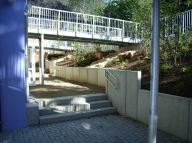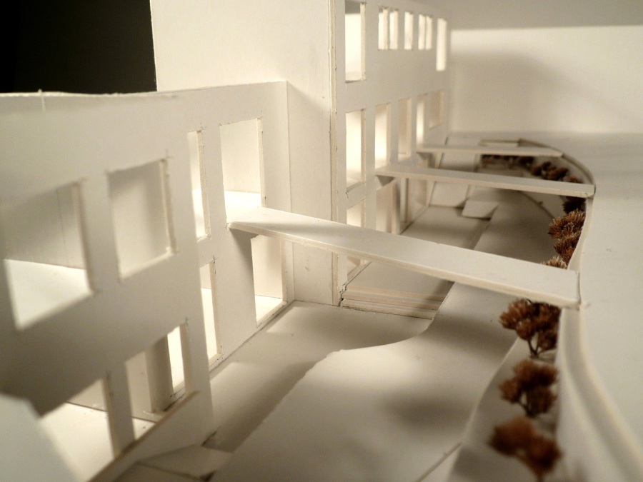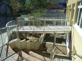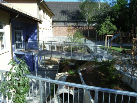 Statt 'Keller-Lichtschachtatmosphäre' entstehen helle Untergeschossräume mit Außenraum. Dafür waren Stege aus den 3 Gruppenräumen im Erdgeschoss über den Tiefhof ins Freie zu führen.