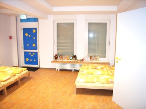 Vorhandene Kellerräume des Kindergartens waren für eine weitere Kita-Gruppe mit Ruheraum und für zusätzliche Nebenräume, einen Sanitärbereich und einen Personalraum umzubauen. Die Räume im Erdgeschoß sollten mit variabler Beleuchtung, Akustik-Decken und neuer Beschichtung modernisiert werden.
