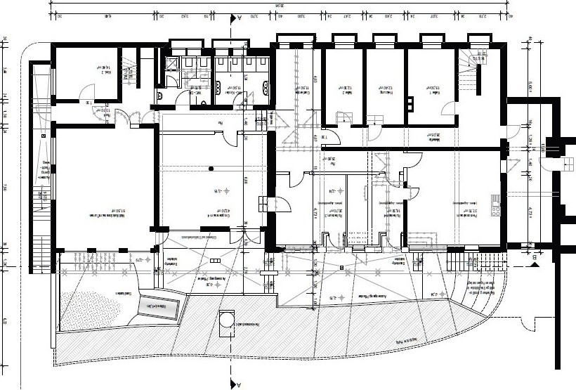 Für bessere Belichtung und Einbeziehung der Kellerräume in den Außenraum haben wir eine Geländeabgrabung und Herstellung eines tiefer gelegenen Hofbereichs vorgeschlagen. Ein Tiefhof mit verschiedenen Niveaus, großem Sandbecken und Tunnelröhre steigt über die Böschung auf Erdgeschosshöhe an.