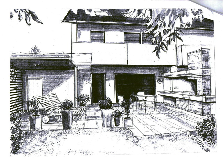 Die neue Terrassenfläche, größere Außenküche und Sitzplatzüberdachung mit Feuer-stelle sollten eine Einheit bilden. In Gesprächen haben wir uns mithilfe von Skizzen, Perspektiven, Katalogen und Materialproben Stück für Stück dem Wunschziel angenähert.